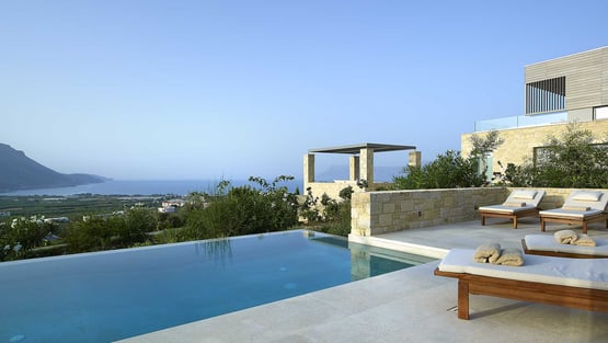 Fully immerse yourself in the Mediterranean lifestyle by staying in our luxury villas, featuring traditional Greek architecture. Cycladic designs with clean lines offer spacious, light-filled living areas, while Mediterranean gardens invite relaxation around private pools. The interiors, with their traditional white vaulted ceilings, blend the charm of cave houses with contemporary refinement.